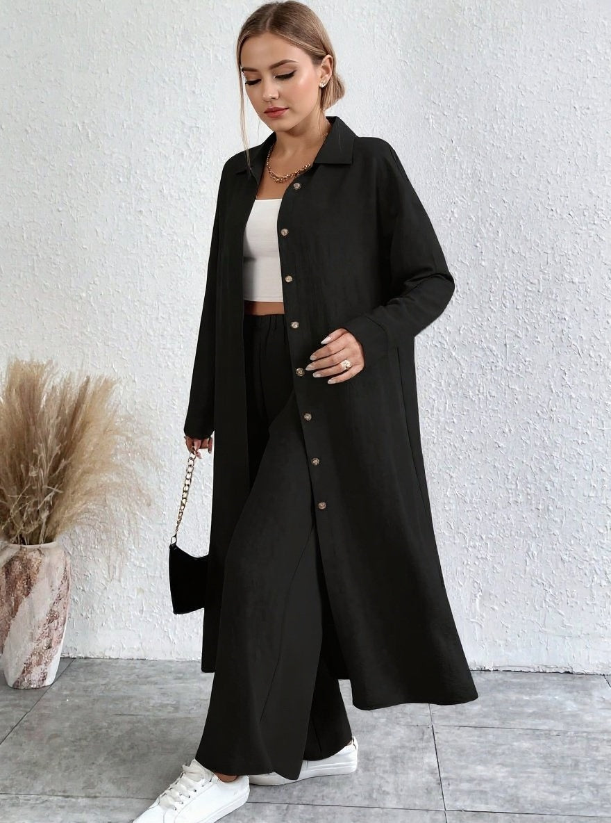 Featuring a long drop-shoulder shirt with a clean button front and wrist-length sleeves, this set offers a soft, elongated silhouette that pairs effortlessly with its relaxed wide-leg trousers. The woven fabric provides a smooth feel with slight stretch, maintaining structure while allowing ease of movement.